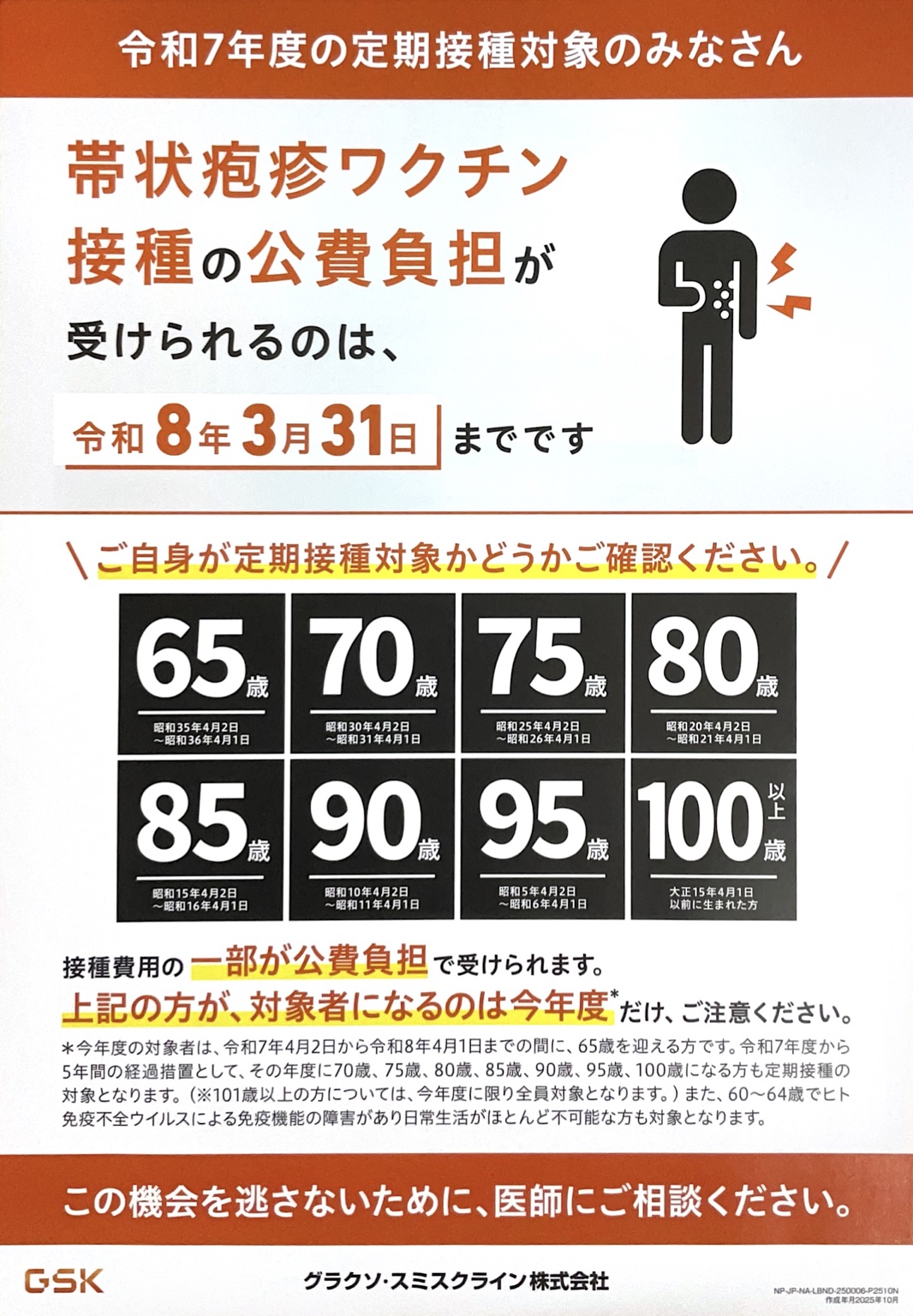 令和7年4月1日より帯状疱疹ワクチンの定期接種が開始しています。